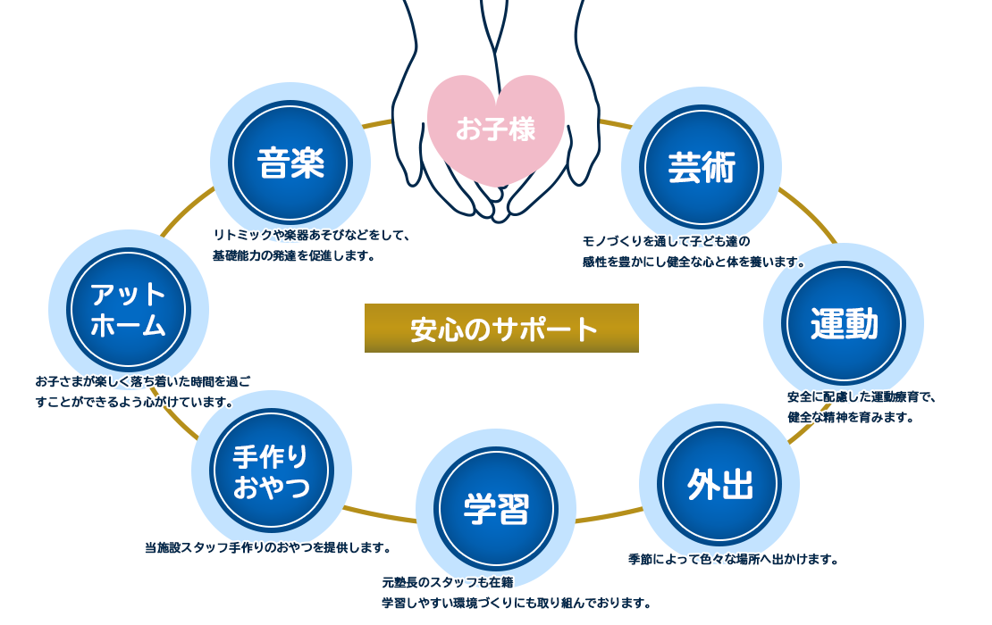 日常生活の自立支援や機能訓練を行ったり、保育園や幼稚園のように遊びや学びの場を提供したりといった障がい児への支援を目的としております。